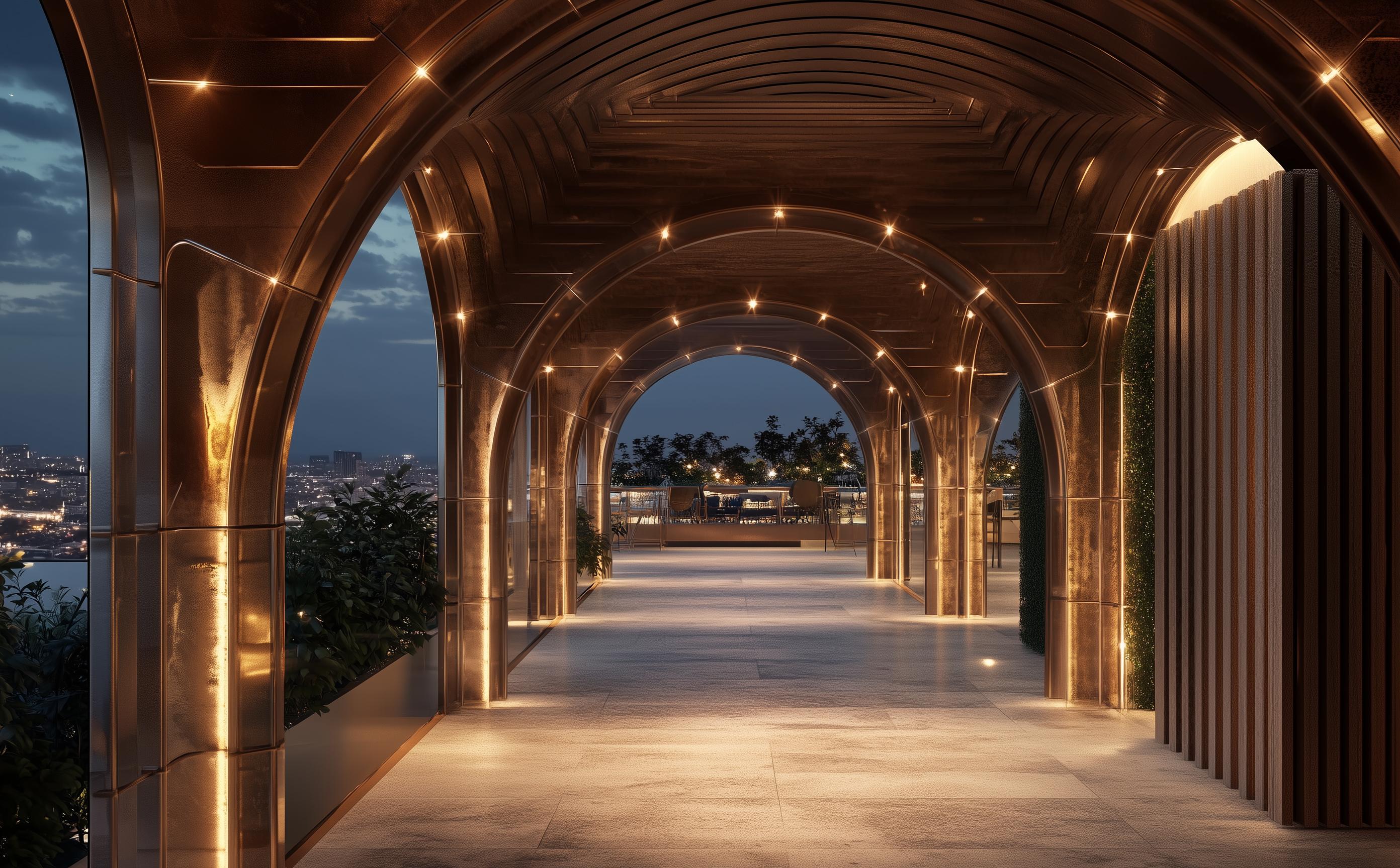 Se voulant comme un mélange de néoclassicisme et d'ultra-modernité, cette structure atypique, en excroissance et en continuité des espaces intérieurs de l’appartement de réception, est une rencontre de différents matériaux qui font honneur aux richesses du pays: bois tropical, pierre du Kivu, ornements d'artisanat local, tous mis en dialogue au service d'une ambiance unique pour un lieu exceptionnel.