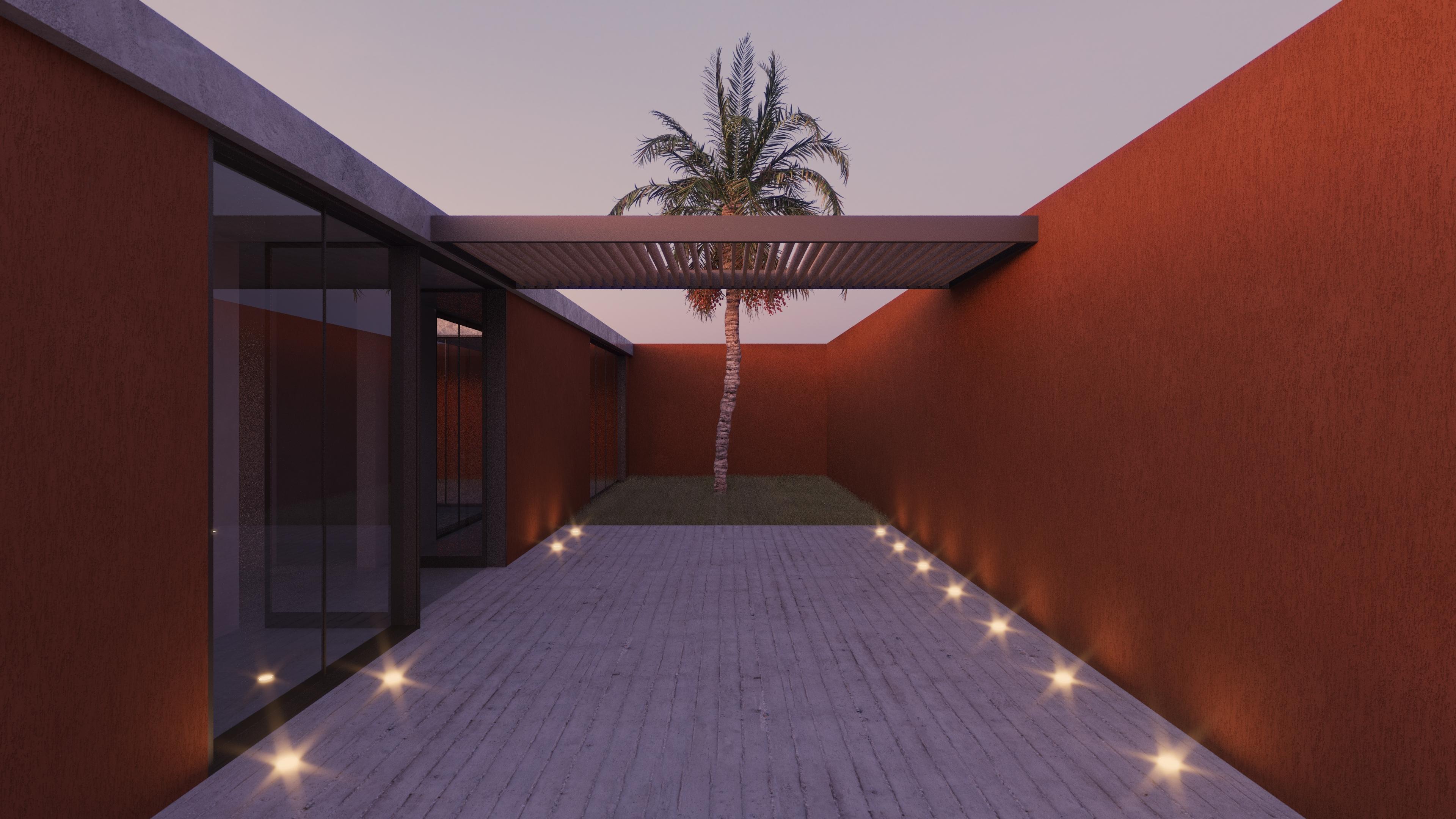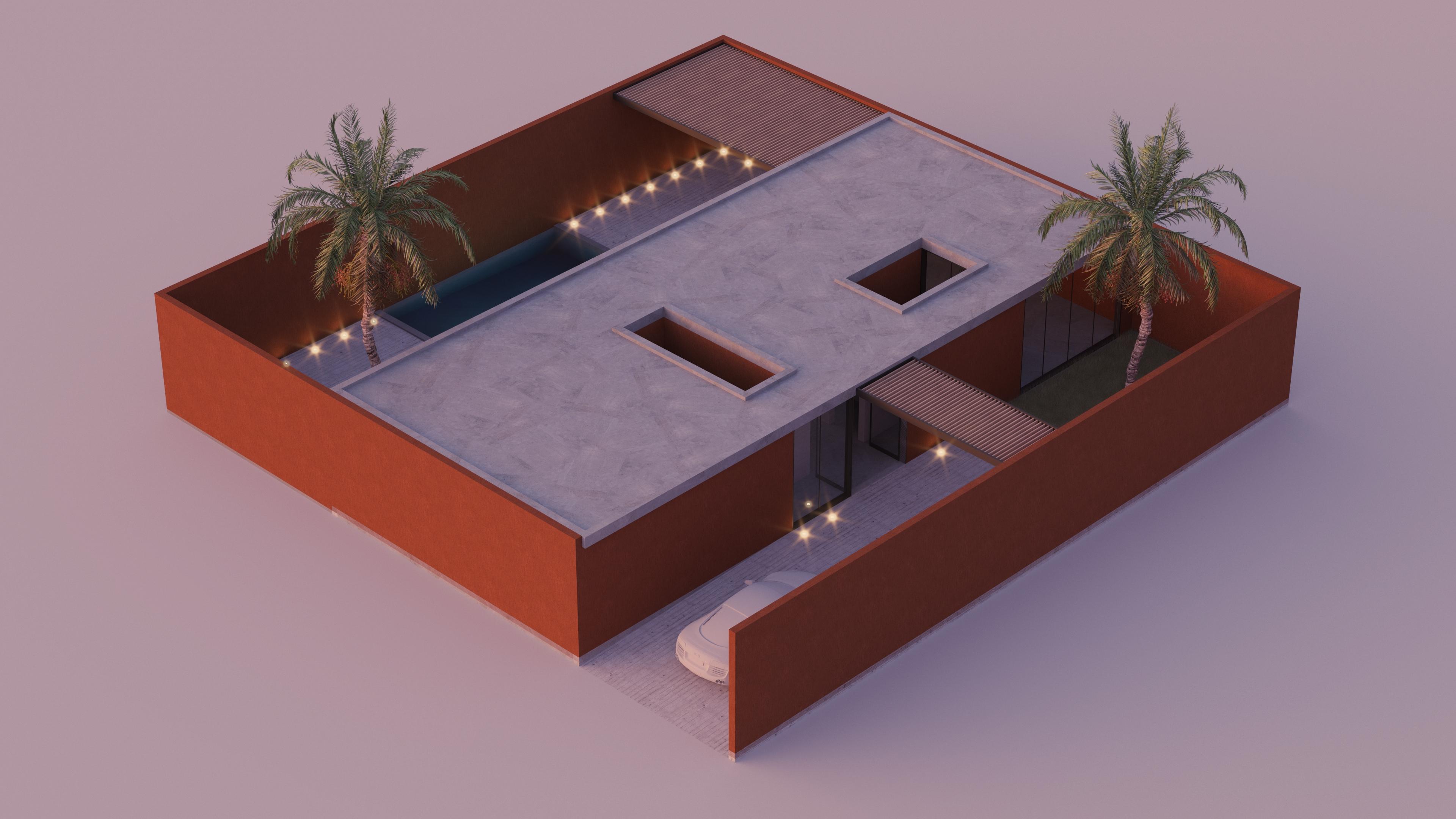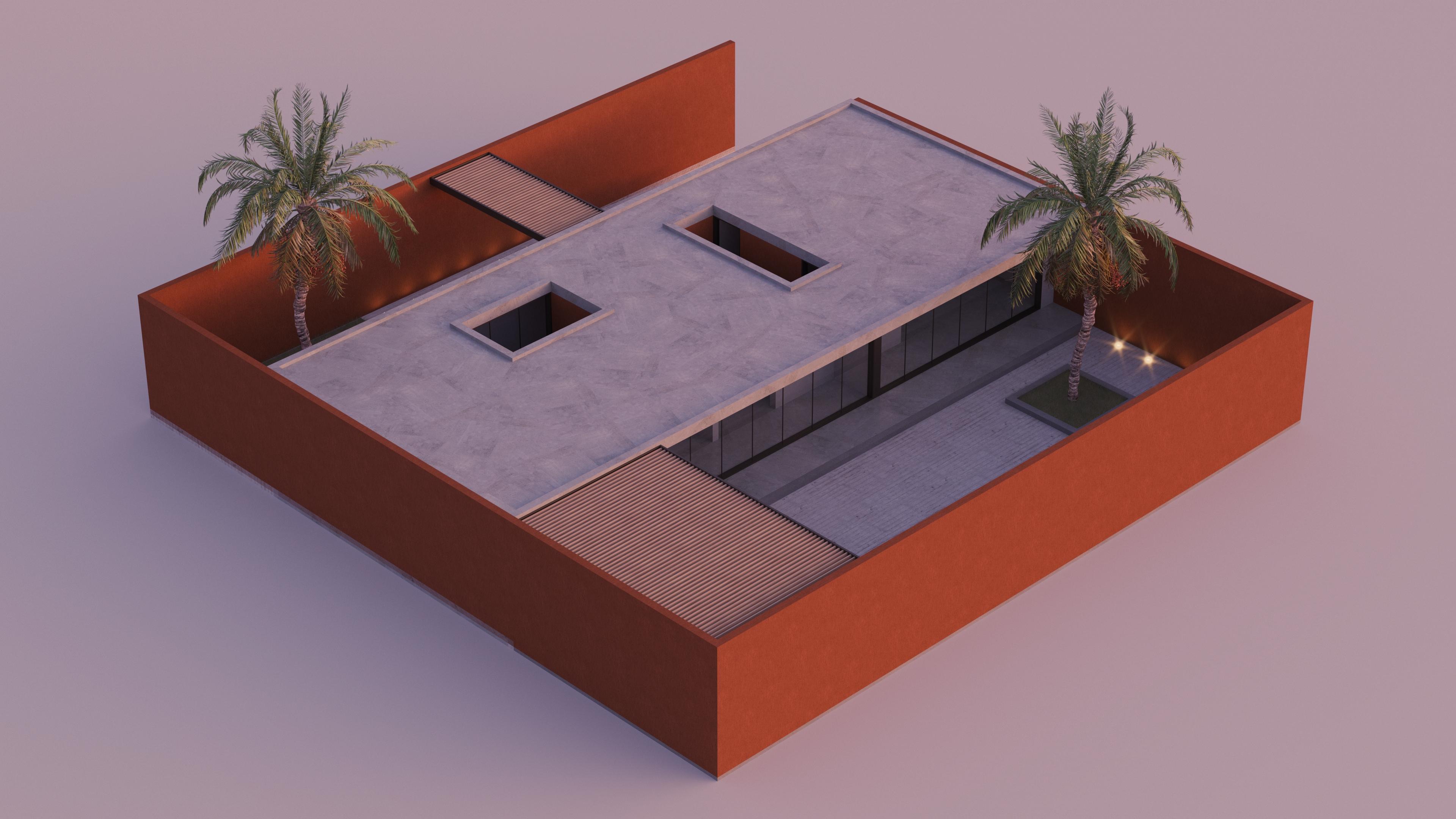 Implantée sur une parcelle de 20x20m, la maison en occupe un tier, générant deux espaces extérieurs, l'un destiné au parking, au parvis d'entrée et à un jardin, l'autre à la cour privée, à la terrasse, à la piscine. La maison est scindée en deux parties par un passage reliant les deux espaces extérieurs, la partie "jour" et la partie "nuit" qui comprennent chacune un patio permettant d'apporter de la lumière et une ventilation naturelle.