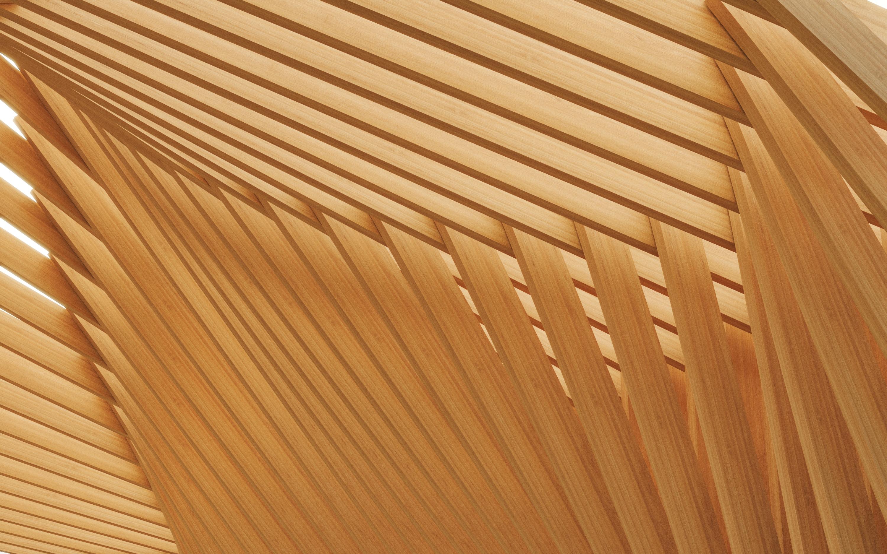 Sa conception est basée uniquement sur des petits éléments de madriers d'afromosia assemblés les uns aux autres afin d'obtenir une structure hyperstatique. L'ensemble des arbalétriers forment une surface courbe à deux génératrices (elle se courbe dans deux sens afin d'optimiser l'écoulement des eaux pluviales) et nécessite l'usage d'une toile tendue permettant d'épouser parfaitement la complexité de la structure. La lumière est filtrée, adoucie par la toile de la couverture, met en valeur l'ossature bois.